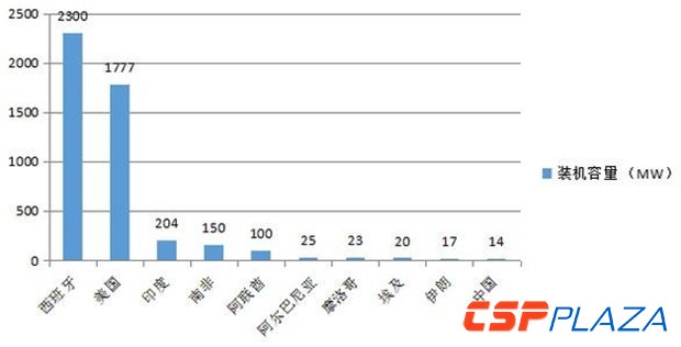 国际可再生能源署(IRENA)统计数据显示,截至2015年12月底,西班牙在运光热电站总装机容量为2300MW,占全球总装机容量近一半,位居世界第一;美国总装机量为1777MW,位列世界第二;两者合计光热装机超过4GW,约占全球光热装机的88%。其后是印度、南非、阿联酋、阿尔及利亚、摩洛哥等国。